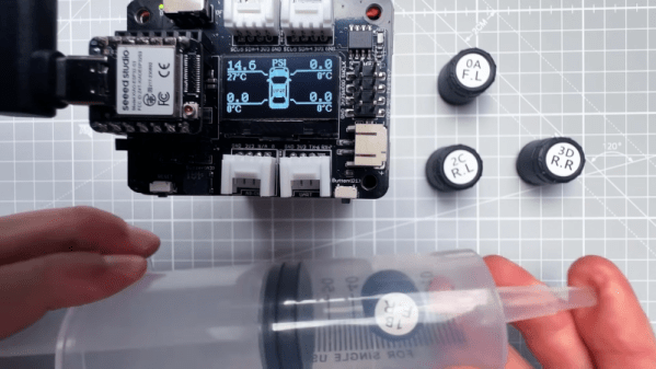 When [upir] saw that you could buy tire valve stem caps that read pressure electronically, he decided to roll his own Tire Pressure Monitoring System (TPMS) like the one found on modern cars. An ESP32 and an OLED display read the pressure values. He didn’t have a car tire on his workbench though, so he had to improvise there.