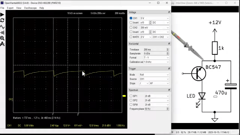 The circuit in question is rather odd at first blush. The BC547 NPN transistor is hooked up between an LED and a resistor leading to a 12V DC line, with a capacitor across the emitter and collector. Meanwhile, the base is connected to… nothing! It’s just free-floating in the universe of its own accord. You might expect this circuit to do nothing at all, but if you power it up, the LED will actually start to flash.