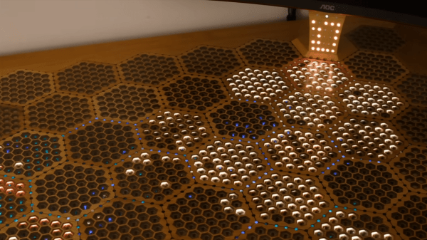 Beehives are impressive structures, an example of the epic building feats that are achievable by nature’s smaller creatures. [Full Stack Woodworking] was recently building a new work desk, and decided to make this piece of furniture a glowing tribute to the glorious engineering of the bee. (Video, embedded below.)