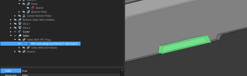 But in that same project I also have an underconstrained sketch, and that one is one of the most likely to change – all the most crucial tolerances that are parametrically adjustable interact with that sketch, and one of the changes I needed to make broke it. So that one is essential to work on before doing anything else – I think with how fiddly the sketch is I will end up breaking it into 3 or 4 sketches, which will mean I could end up with some fillets I’ll have to add in manually afterwards, or just accept less than smooth transition between the important mating surfaces in the CAD knowing 10 seconds with a file in the real world will fix the problems…