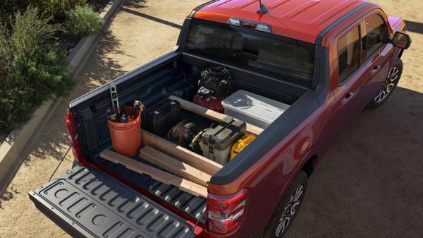 Another part of Ford’s DIY invitation is in the cargo area, whose sides were stamped with slots for lumber beams supporting projects like a ~$45 bike rack. There are also threaded bolt holes already in the bed, no drilling or tapping into sheet metal necessary. Behind a few small plastic doors are wires to supply 12 V DC power without the risk of splicing into factory harnesses.