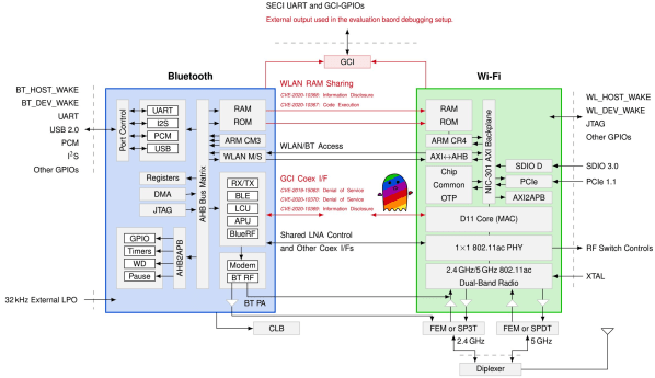 Spectra is a new attack class demonstrated in this DEF CON talk, which is focused on Broadcom and Cypress WiFi/Bluetooth combo chips. On a combo chip, WiFi and Bluetooth run on separate processing cores and coexistence information is directly exchanged between cores using the Serial Enhanced Coexistence Interface (SECI) and does not go through the underlying operating system.