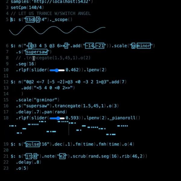 The super talented [Switch Angel] is an electronic music artist, with a few cool YouTube videos to show off their absolute nailing of how to live code with Strudel. For us mere mortals, Strudel is a JavaScript port of TidalCycles, which is an algorithmic music generator which supports live coding, i.e. the music that is passed down to the synthesizer changes on-the-fly as you manipulate the code. It’s magical to watch (and listen!) to how you can adapt and distort the music to your whims just by tweaking a few lines of code: no compilation steps, hardly any debugging and instant results.