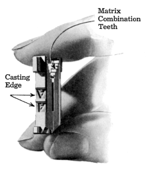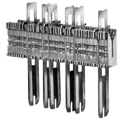 If you have been paying attention, there’s one major drawback to this system. How do the matrix elements get back to the right place in the magazine? If you can’t automate that, you still have a lot of manual labor to do. This was the job of the distributor. First, the space bands were sorted out. Each matrix has teeth at the top that allow it to hang on a toothed distributor bar. Each letter has its own pattern of teeth that form a 7-bit code.