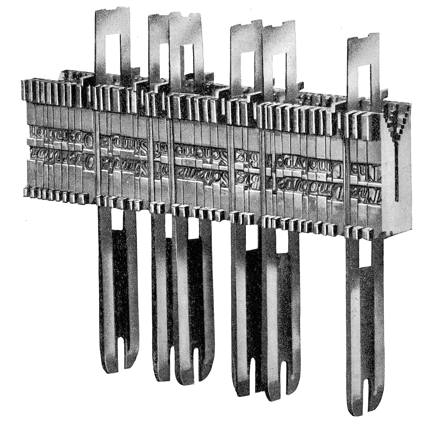 Note that before Linotype machines, there was the Ludlow process, which used hand set matrices to cast a slug for a line of type. This was basically the traditional movable type process, except that since the letters in the matrices were not reversed it was a bit easier to check for errors, and you were guaranteed fresh type for every printing run as old slugs were melted down and new slugs cast.