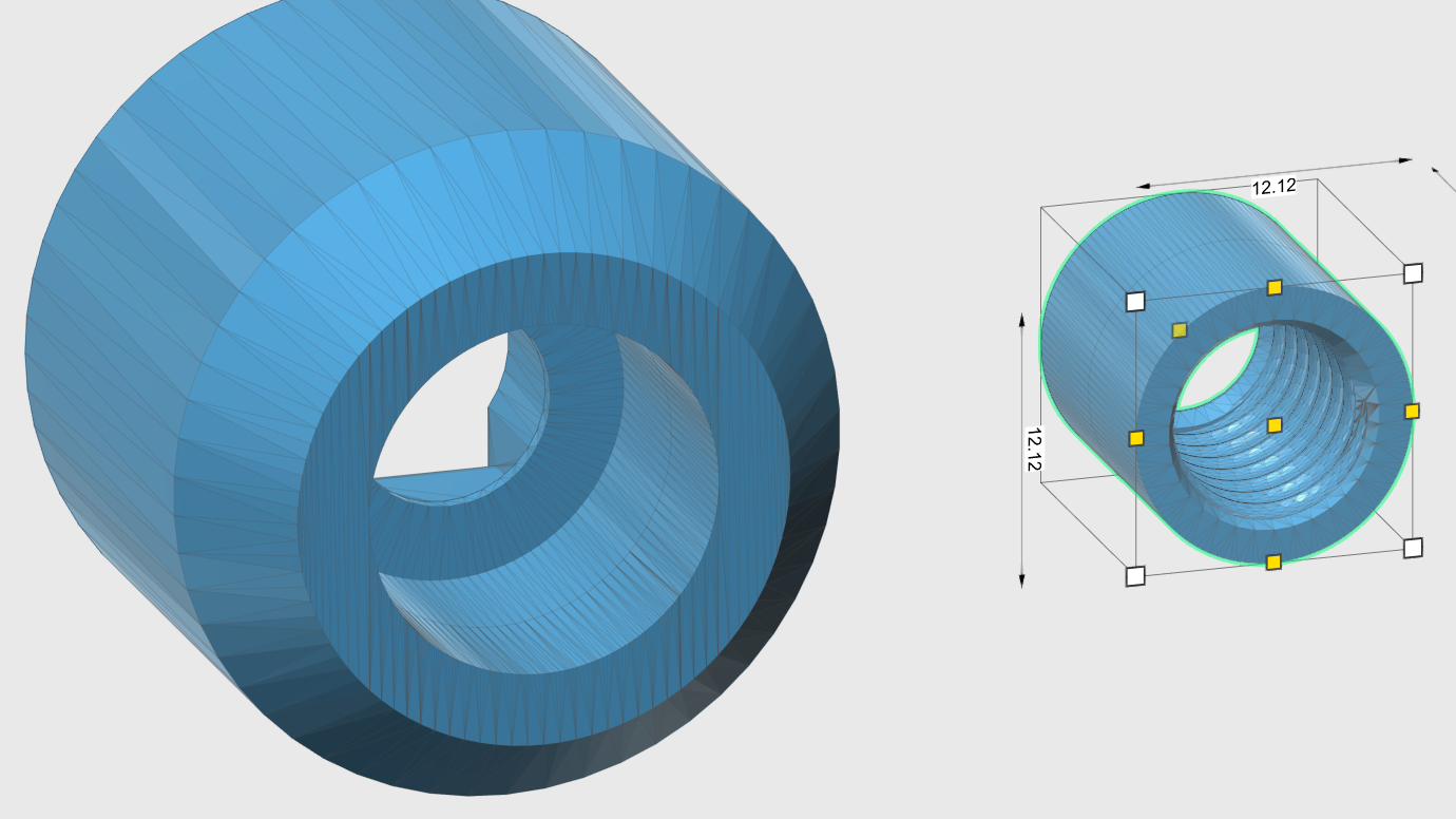 Before and after. Left: the original model made for a spring with a larger diameter. Right: after cutting out, resizing, and then merging the threaded area back in.